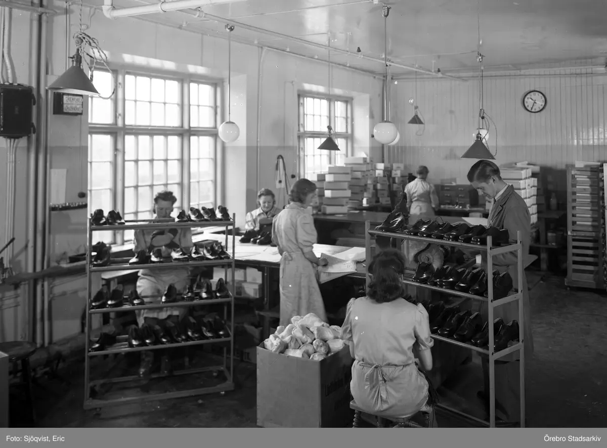 Personal putsar skor och fyller med papper på Kronan Skofabriks AB, 1940-1941