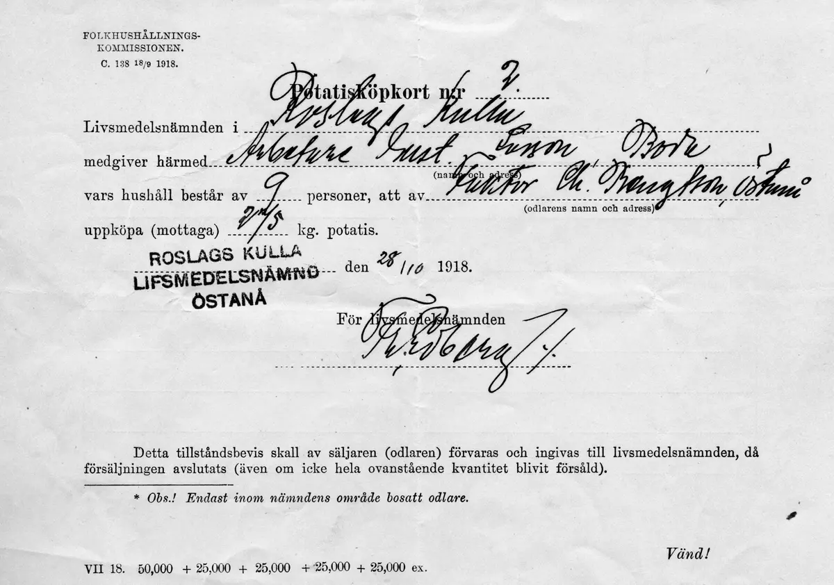Potatisköpkort Roslagskulla Östanå
