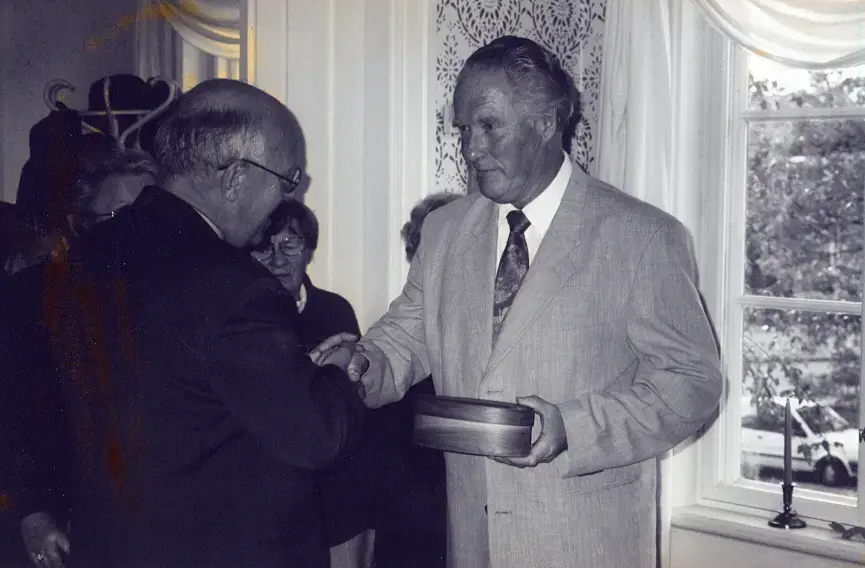 Utdelning av 98års kulturpris till Hans Harlén av Göran Furuland.