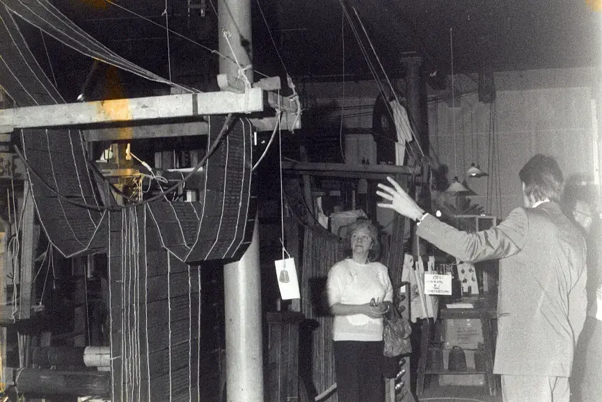 Oscar Almgren visar Sidenmuseets Jaquardvävstol 1992.