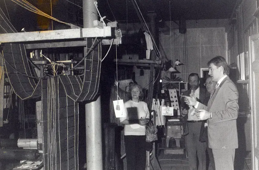 Oscar Almgren visar Sidenmuseets Jaquardvävstol 1992.