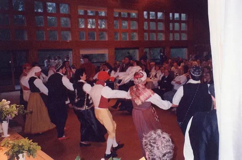 Titel: Hembygdsfest i Tensta 2000. Spånga folkdanslag och syrianska föreningen dansar tillsammans.