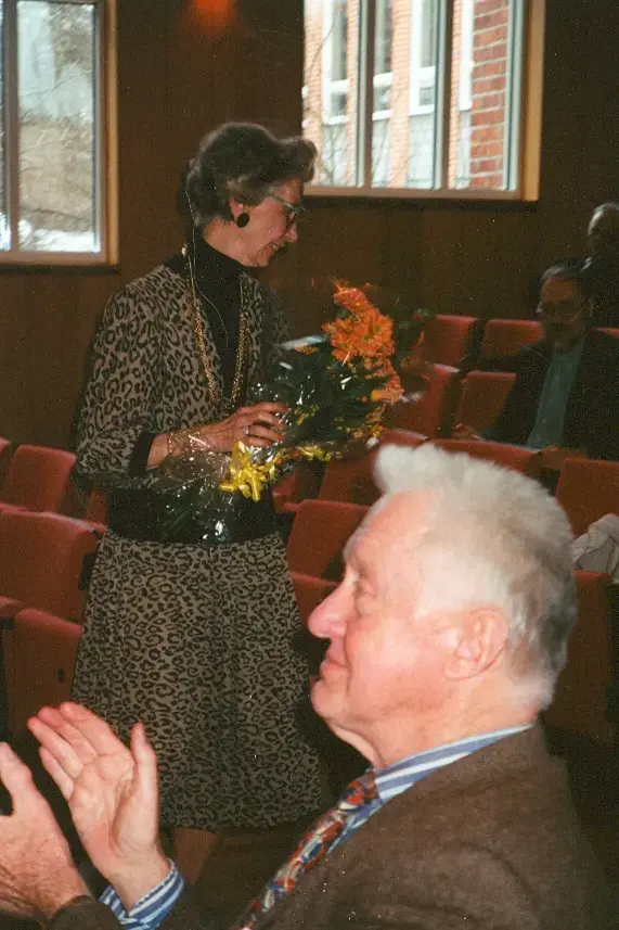 George Geeber blir hedersledamot vid årsmötet i Nacka 1997 och lämnar blommorna till fru Anne-Marie.