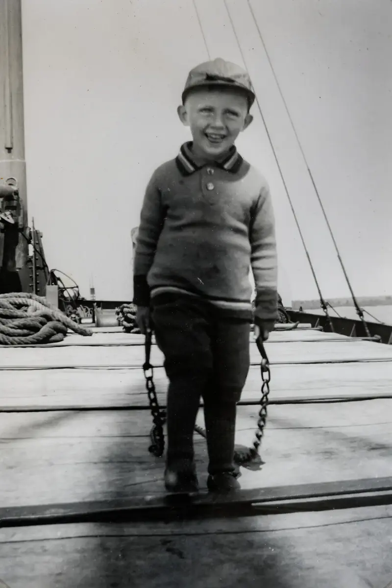 Lennart Blomdin på sin far Edwins pråm, släpande på kedjor i tidig ålder. Lennart drev under lång tid sin omtyckta verkstad på Björkö. Bilden är tagen ca 1943.