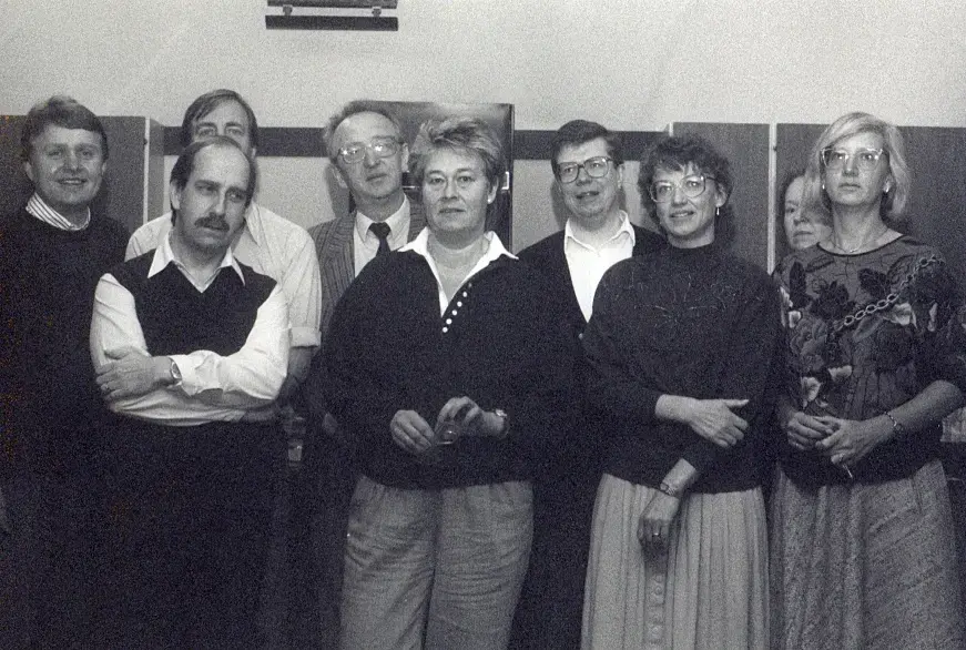 Titel: Riksförbundets personal januari 1989 Från vänster Mats Rolén, Arild Arntzen, Nils Åkerström, Sven Thorstensson, Anita Henriksson, Nils Westling, Kerstin Tjärnbro, Ulla Tander, Gunilla Lindberg.