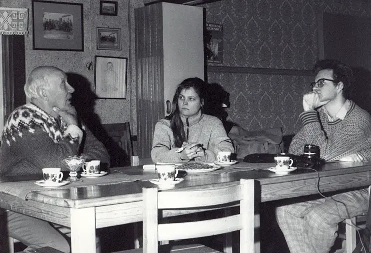 Catherine Couturier och Lars Kaijser intervjuar Omar Nilsson, Fasterna hembygdsförening under arbetet med inventering av hembygdsföreningar i Uppland 1986-87.