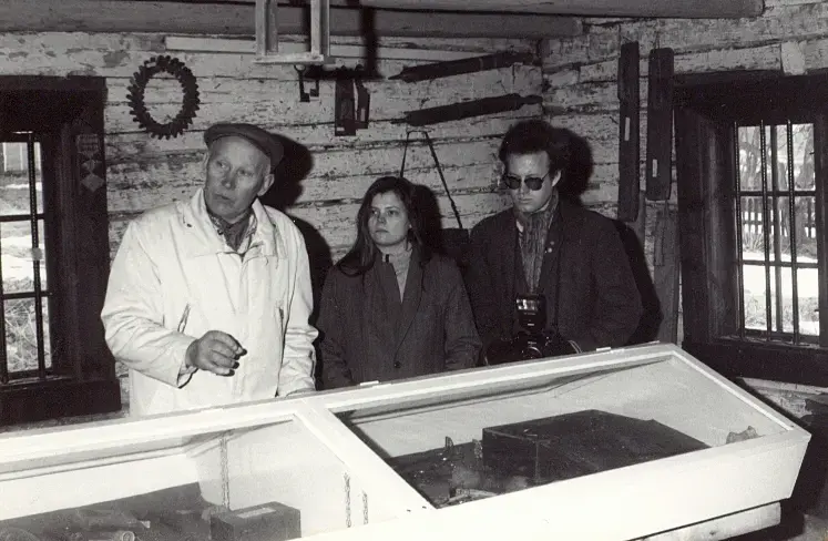Catherine Couturier och Lars Kaijser intervjuar Omar Nilsson, Fasterna hembygdsförening under arbetet med inventering av hembygdsföreningar i Uppland 1986-87.