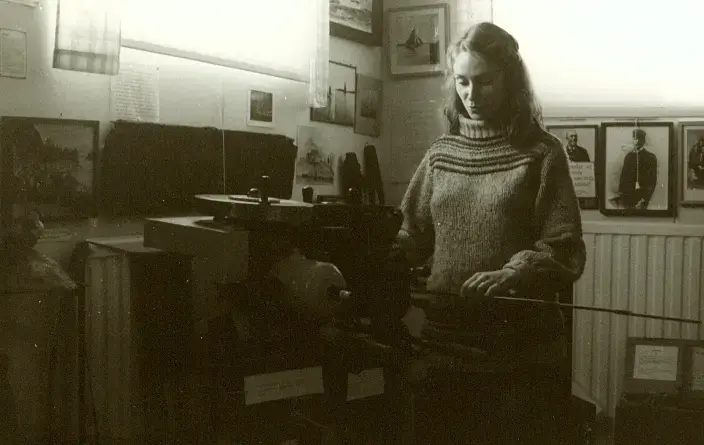 Catharina Berthilsson katalogiserar föremål i Skärgårdsmuseet. Mars-juni 1982.