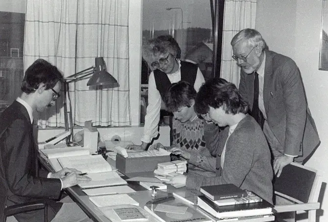 Bertil Elowson, Ann-Charlotte Backlund och Carolina Andersson arbetar med länsbibliografin under överinseende av kulturchef Inger Bergström och bibliotekarie Lars G. Andersson.