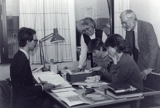 Bertil Elowson, Ann-Charlotte Backlund och Carolina Andersson arbetar med länsbibliografin under överinseende av kulturchef Inger Bergström och bibliotekarie Lars G. Andersson.