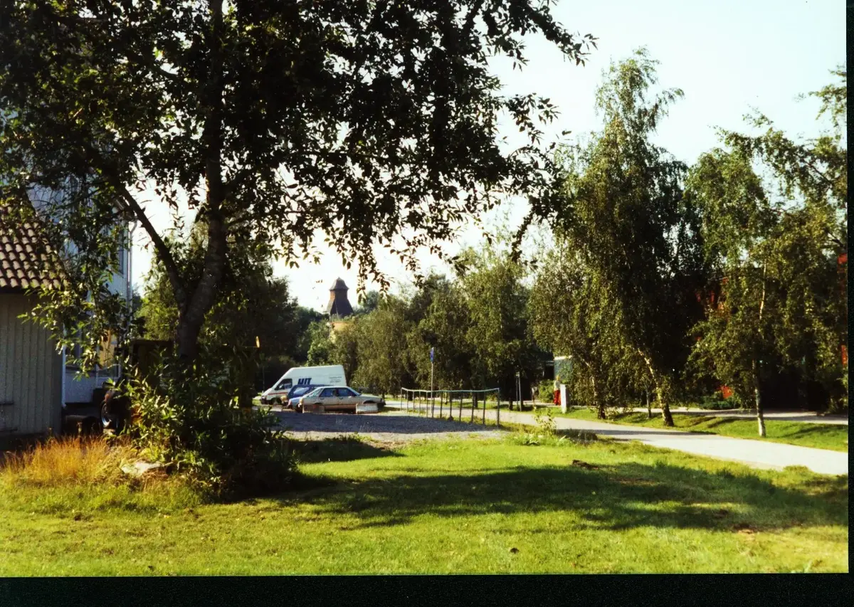 Gång- och cykelväg parallellt med Prästgårdsvägen. Midgård till höger och klockstapeln i fonden.