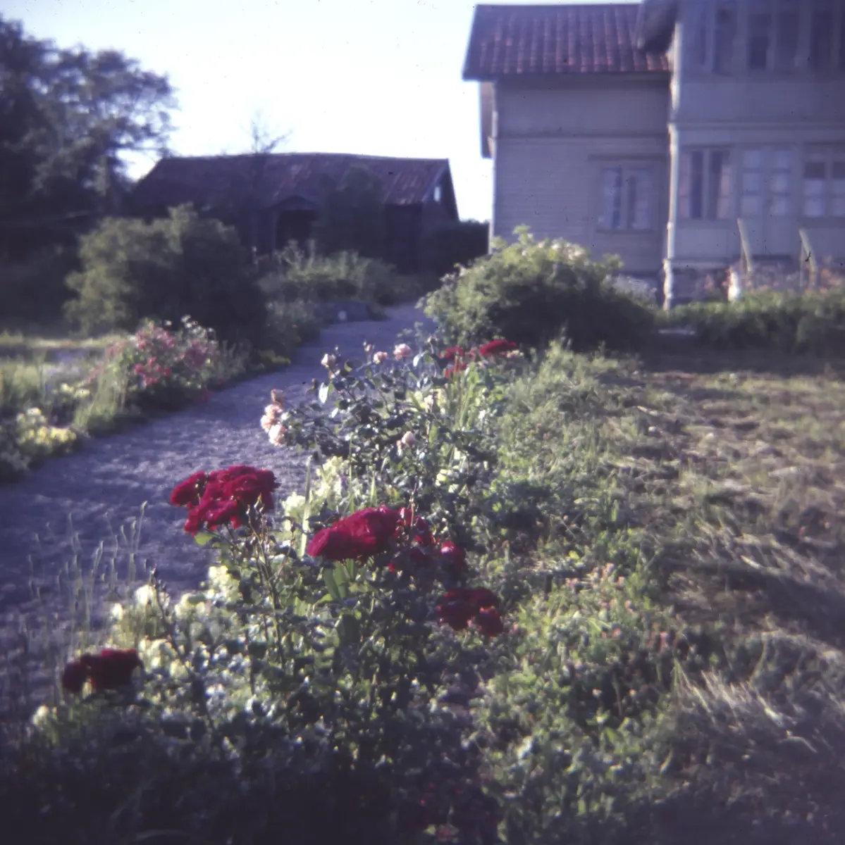 Brottö; blomsterprakt; krattad grusgång hos paret Frej (Frey?) som hyrde Harrys hus under många år.