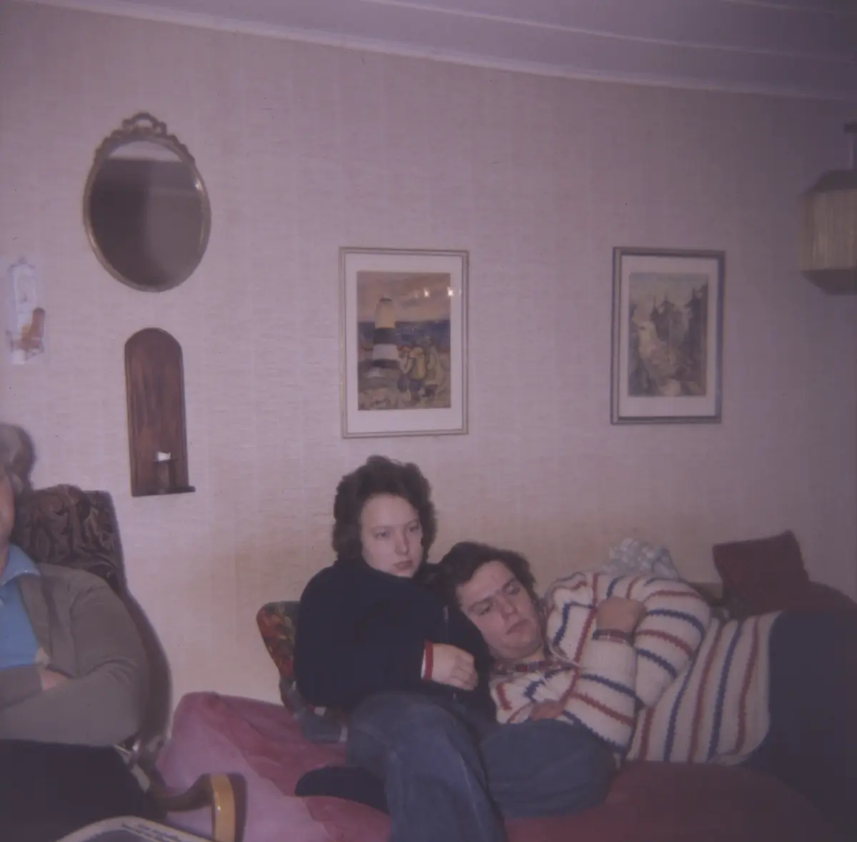 Brottö; Gertrud; Matts farmor till vänster och Solveig och Matts i soffan. Källarstugan hos farmor Gertrud.