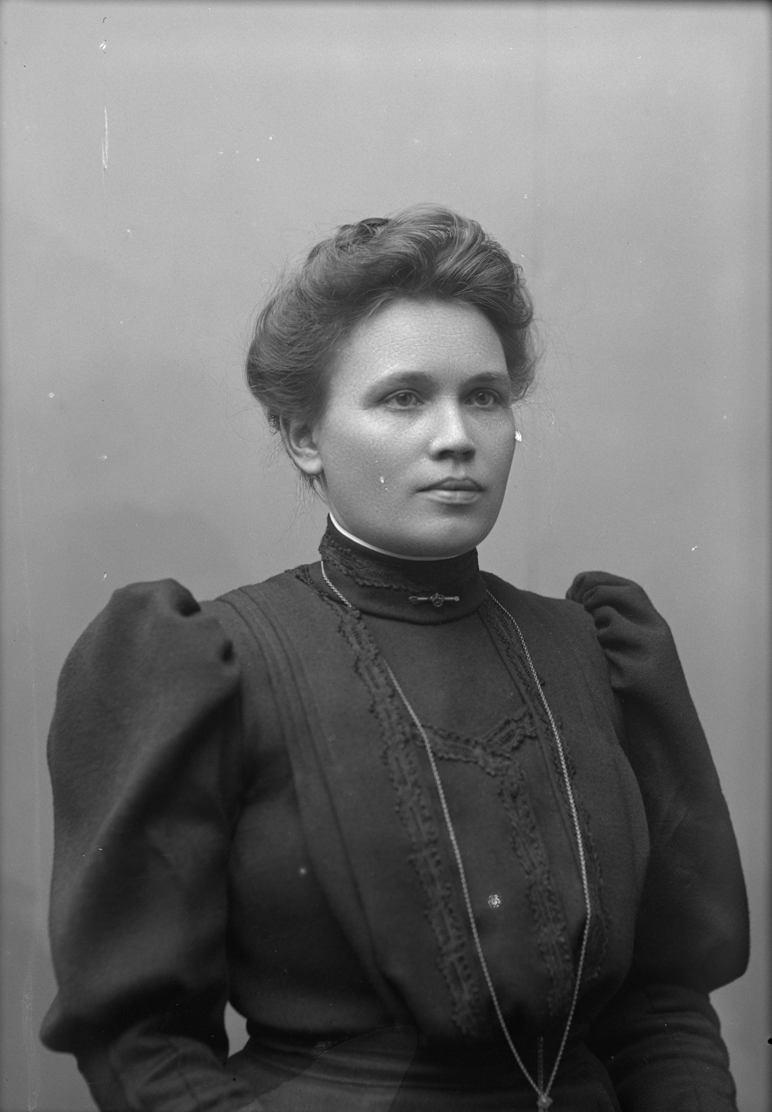 Beskrivning: Porträtt i halvfigur av fru Brandt i blus med puffärmar.