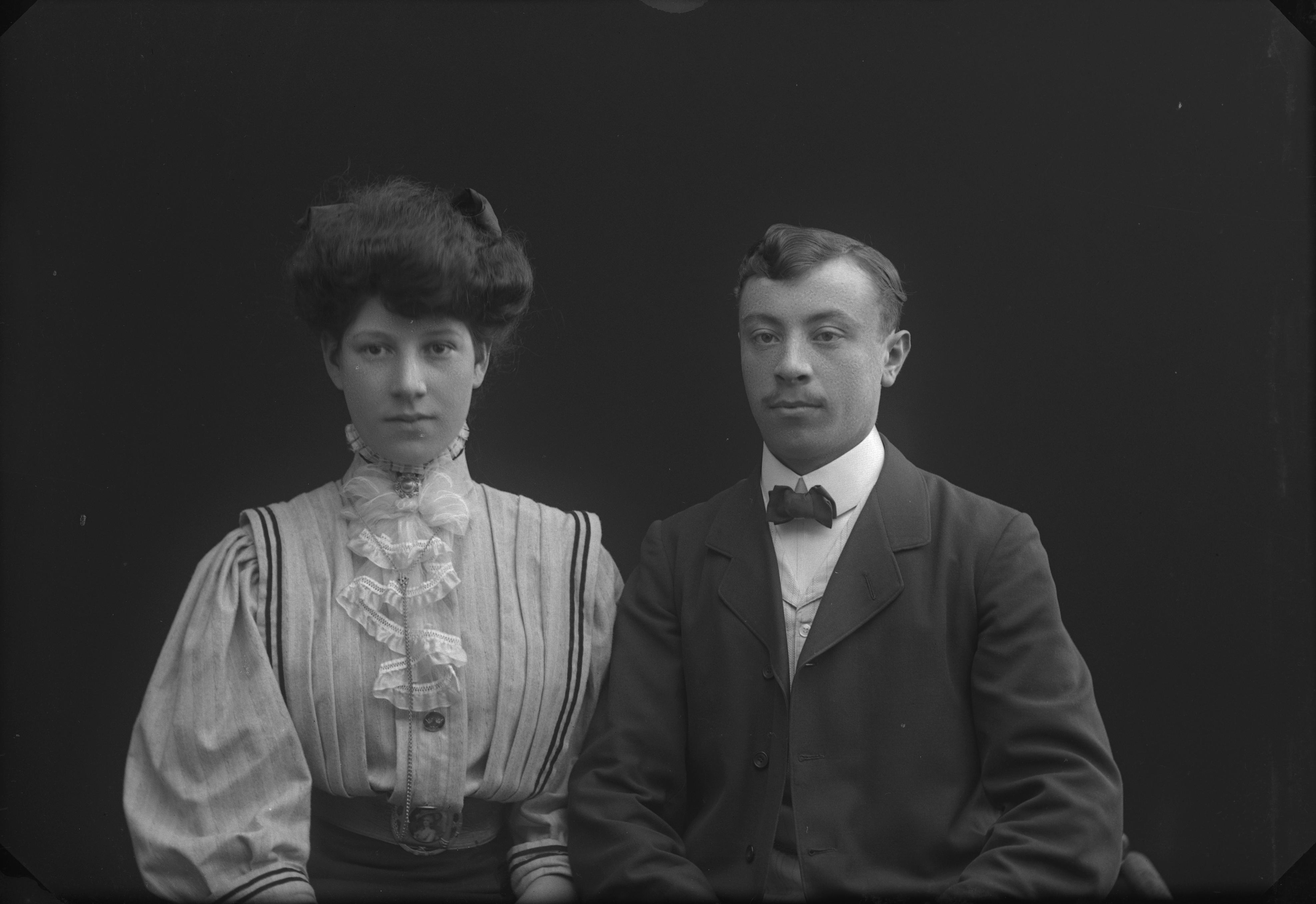 Beskrivning: Porträtt i halvfigur av herr Sundell med fru.