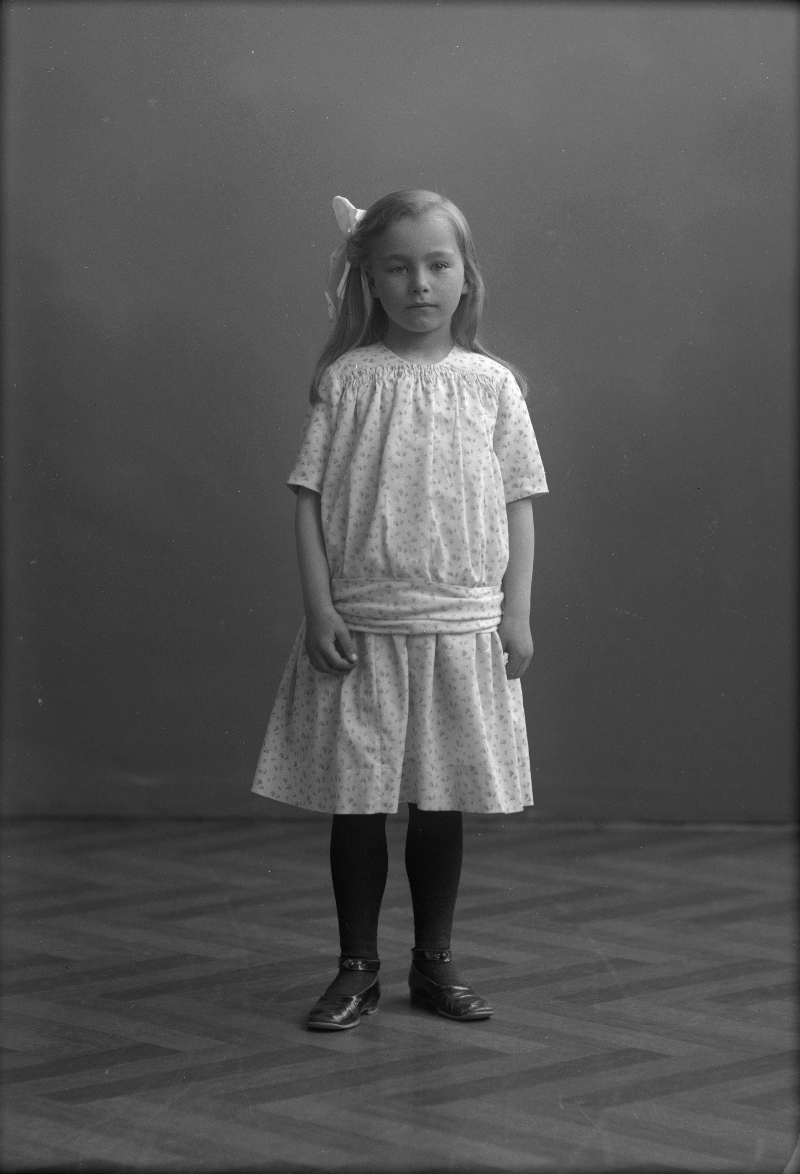 Beskrivning: Porträtt i helfigur av Karin Löfberg med rosett i håret.