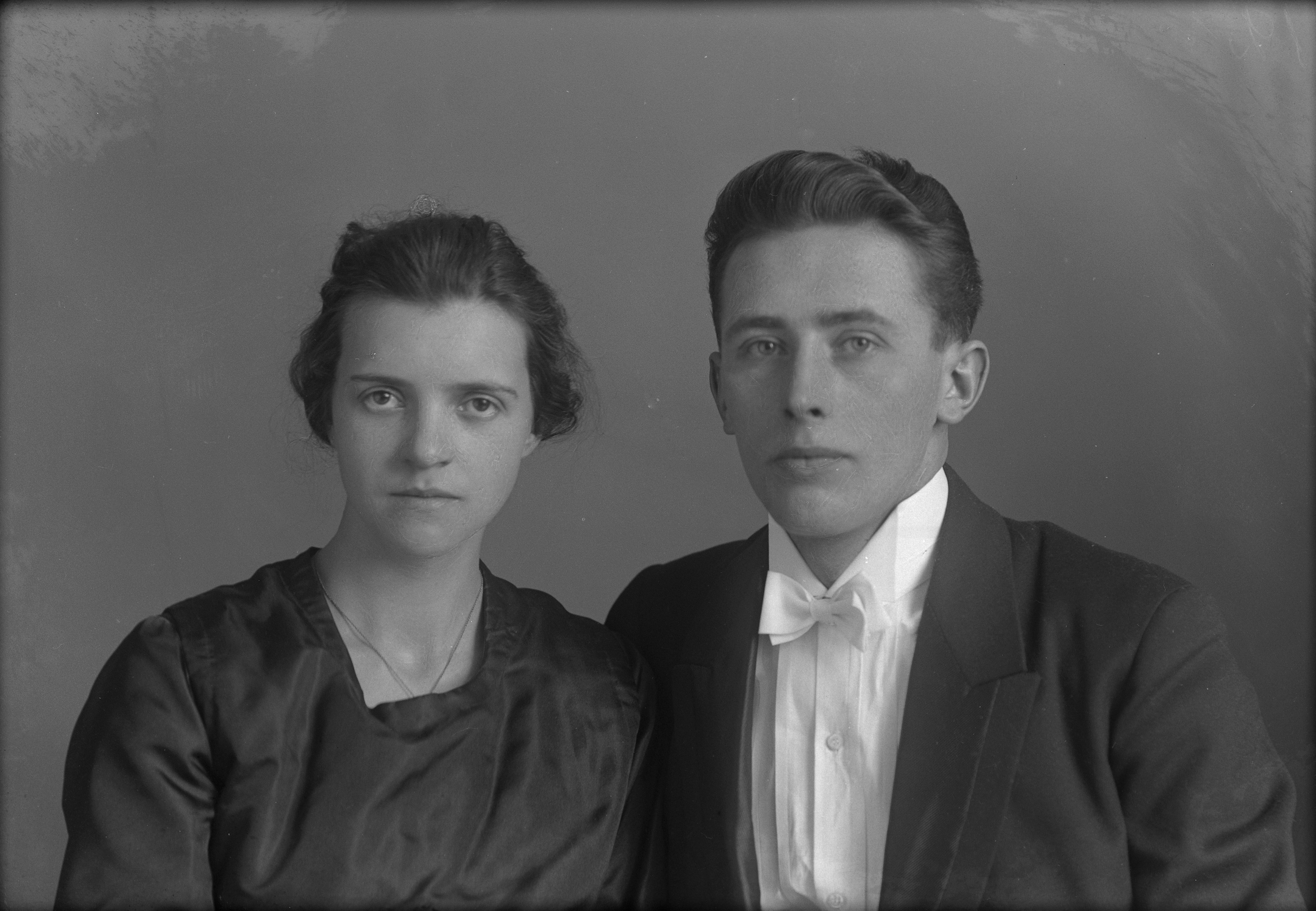 Beskrivning: Porträtt i halvfigur av kontorsbiträde V. Nygren med fru.