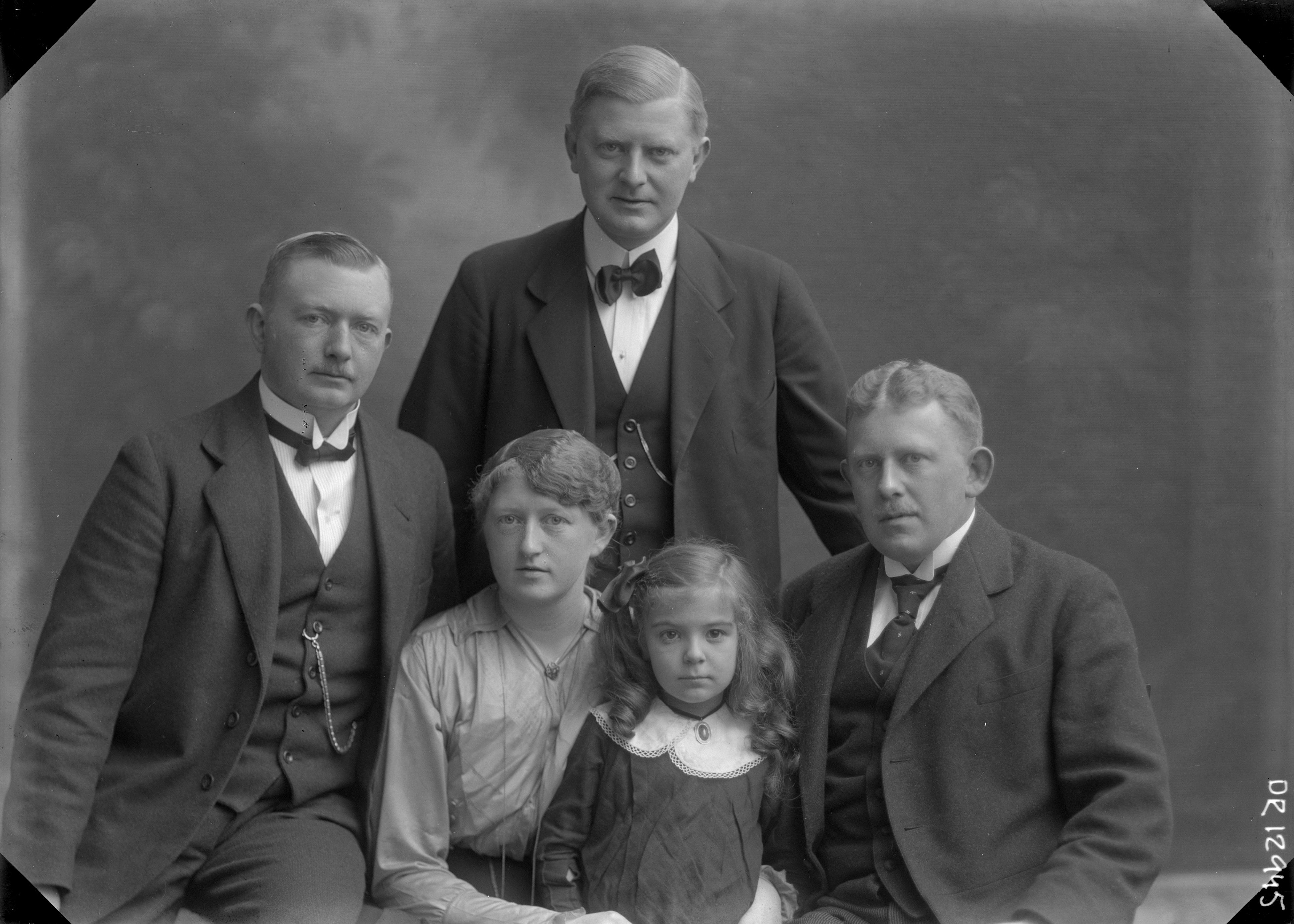 Pettersson (?), 3 män, kvinna o barn, halvbild.