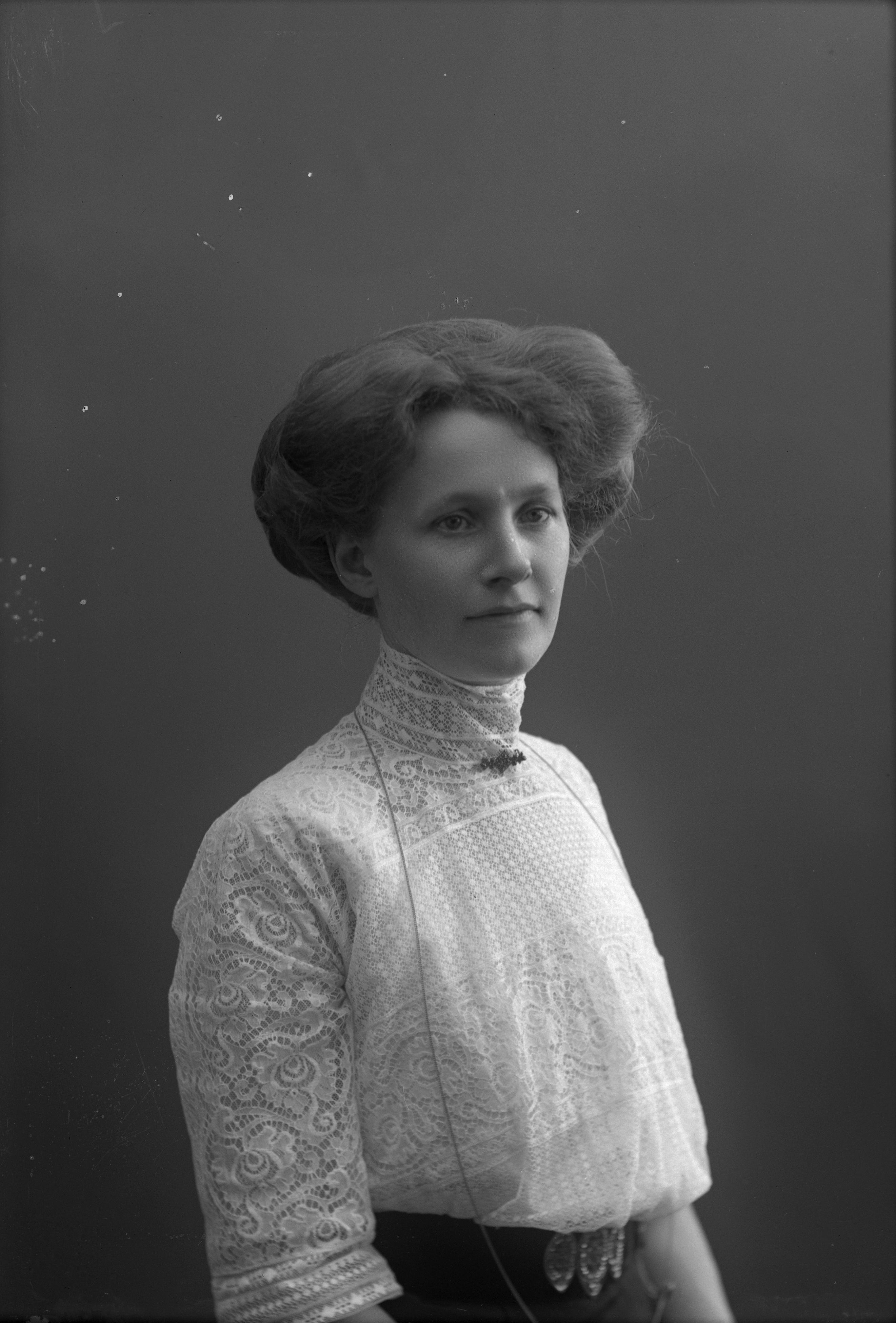 Beskrivning: Porträtt i halvfigur av Karin Ivarson.