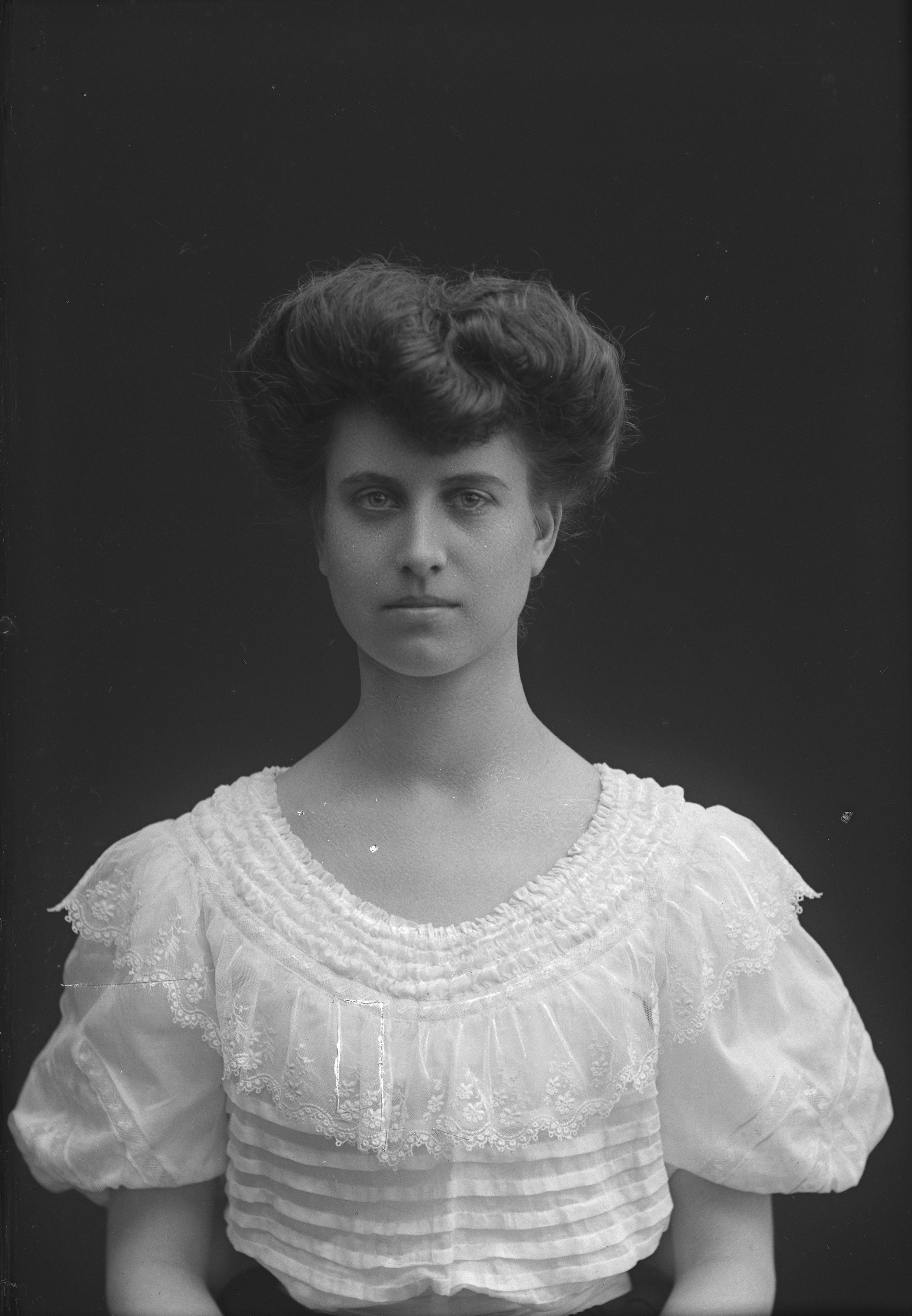 Beskrivning: Porträtt i halvfigur av Hilda Persson.