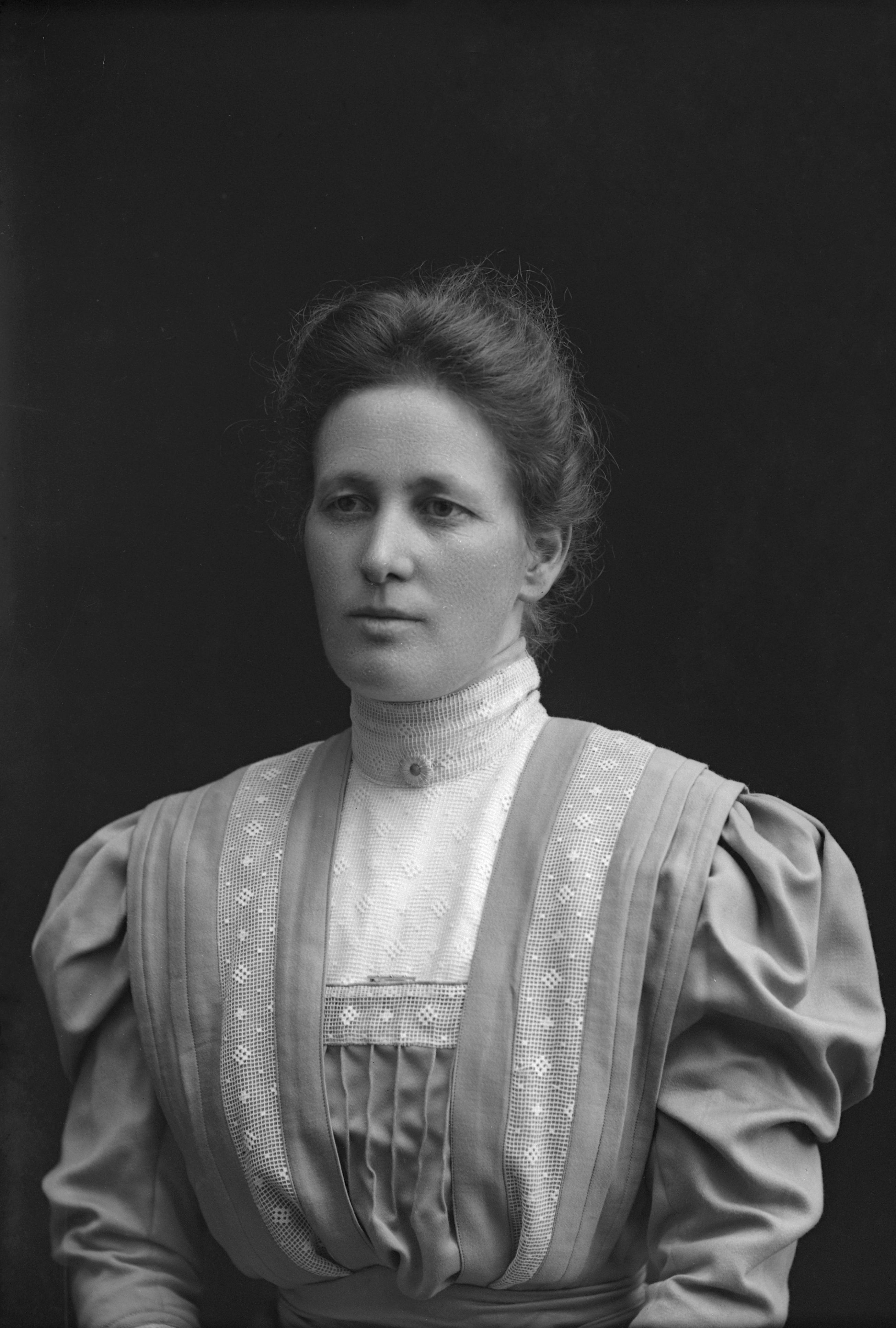 Beskrivning: Porträtt i halvfigur av Hilda Jönsson.