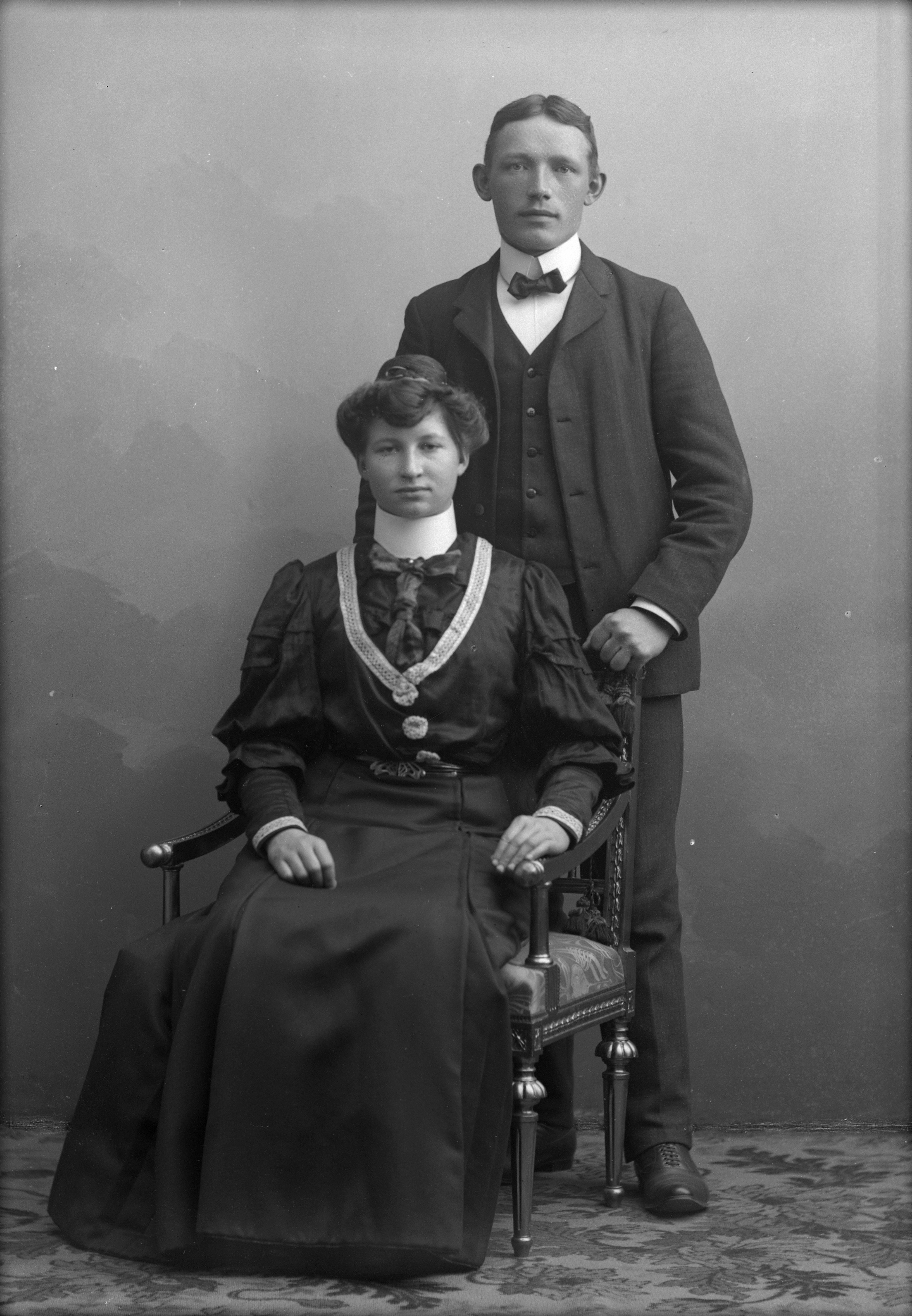 Beskrivning: Porträtt i helfigur av K. Hj. Bengtsson med fru. Frun sittande i stol.