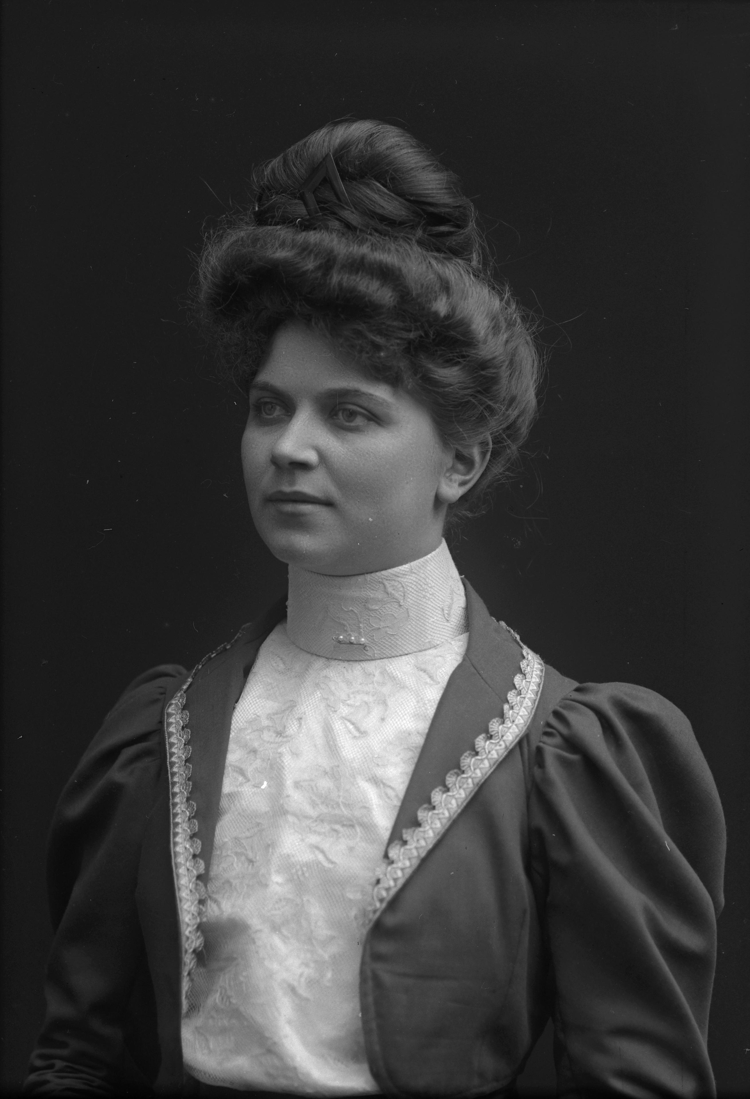 Beskrivning: Porträtt i halvfigur av Elida Jönsson i Hurva.