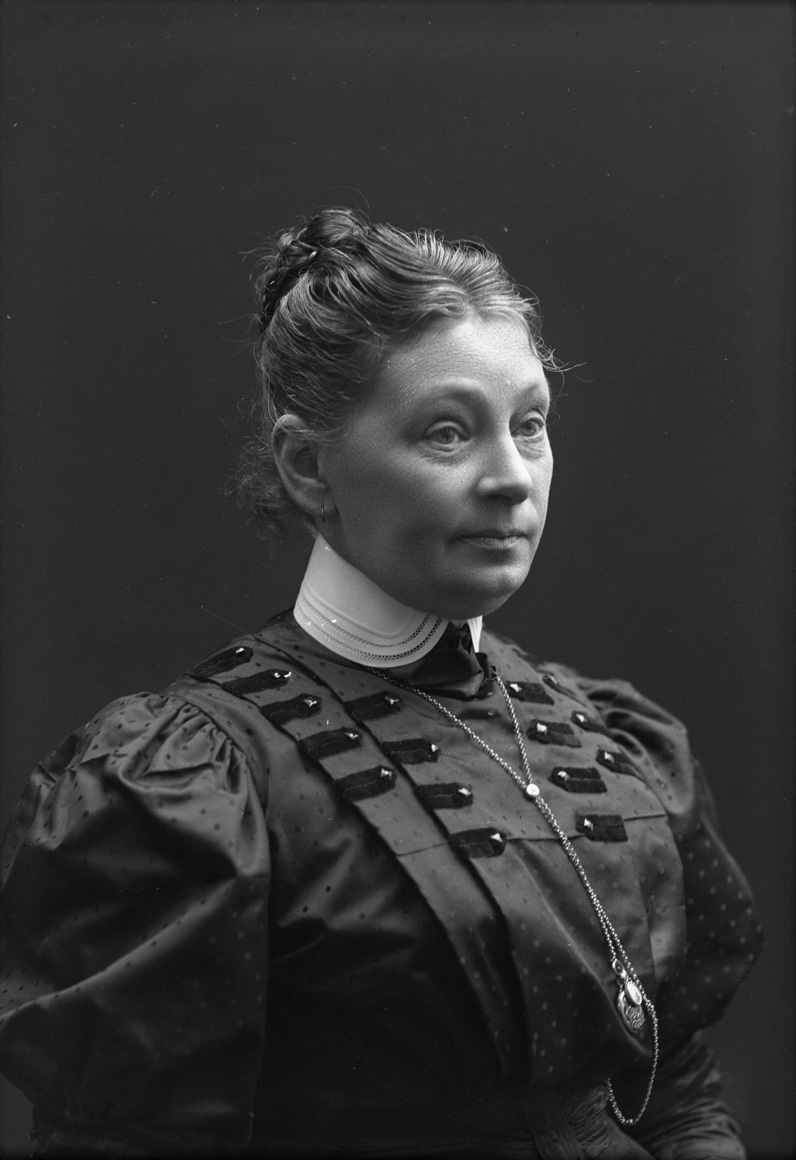 Beskrivning: Porträtt i halvfigur av fru Jönsson i Annelöv.