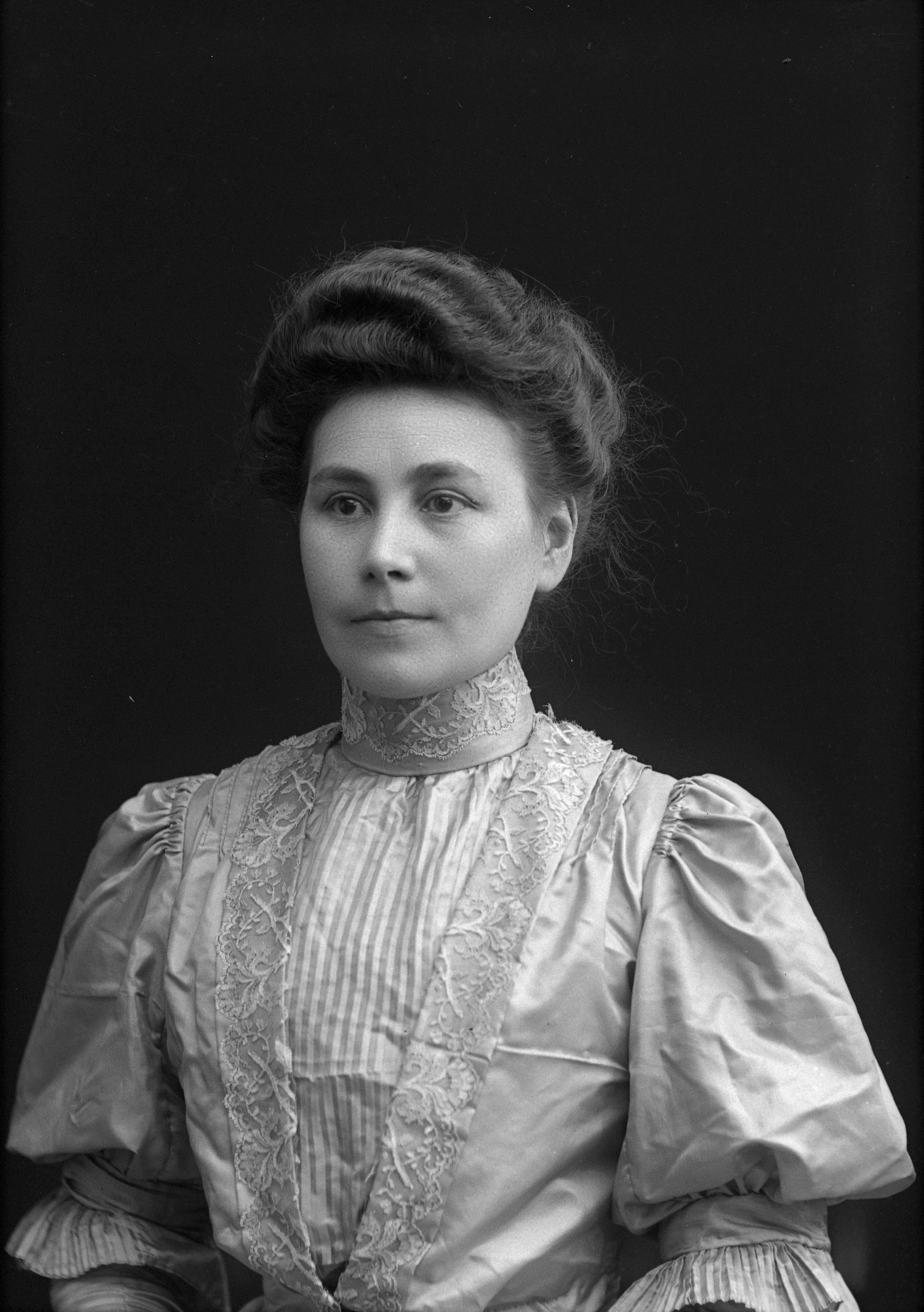 Beskrivning: Porträtt i halvfigur av fru Nilsson /Kämpinge /Håslöv.