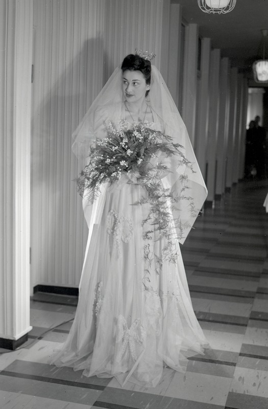 Excellas mannekänguppvisning på Hotell Mollberg. Fotografi av en mannekäng iklädd bröllopsklänning, slöja och brudkrona. Hon håller i en brudbukett.