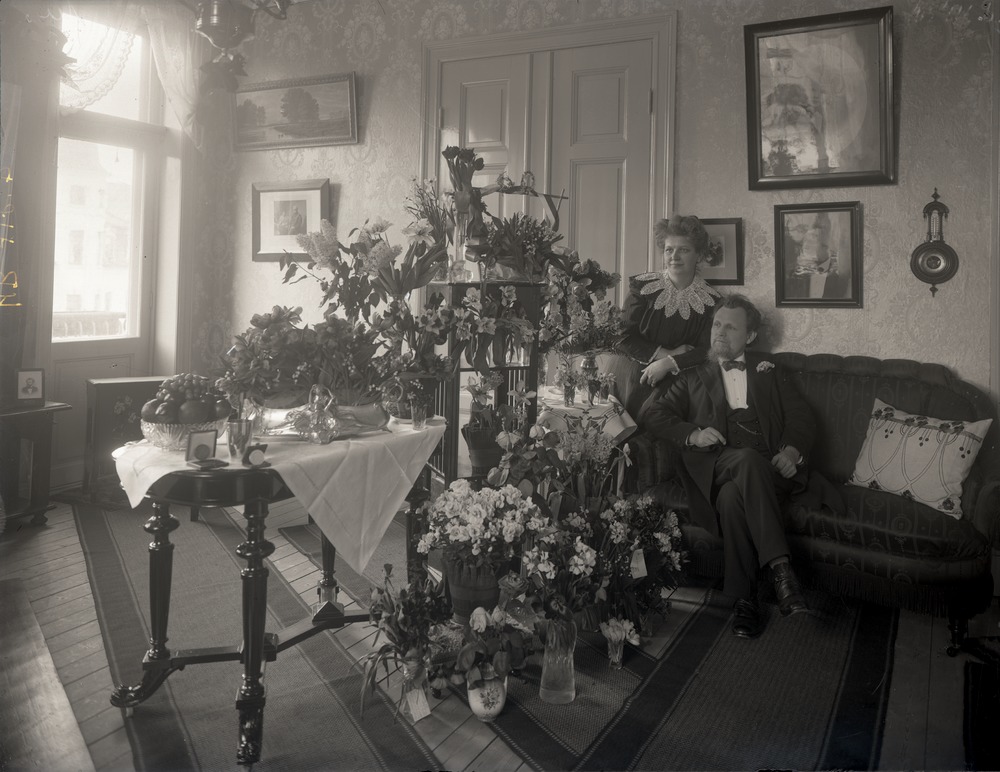 Beskrivning: Fotografi av redaktör Axel Svensson och hans fru, Elvina Svensson, på Axel Svenssons 60-årsdag. Axel sitter i en soffa och Elvina står snett bakom honom, vid sidan av soffan. Soffan är placerad till vänster i bild. Framför dem står en mängd blomsterarrangemang på två bord, en piedestal och på golvet. På väggen bakom soffan hänger tavlor och till höger i bild, på en yttervägg, finns en balkongdörr.
