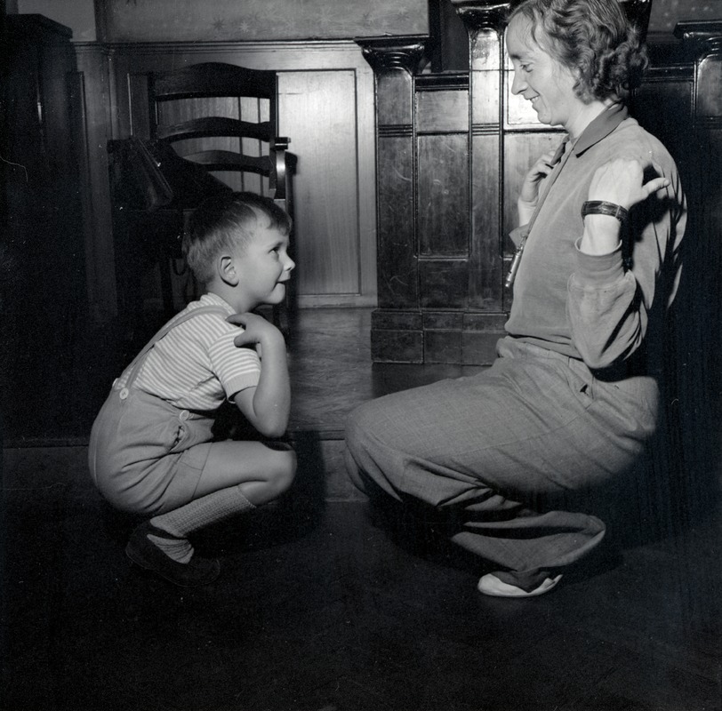 Barngymnastik på Temperancelokalen. Fotografi av en pojke och en kvinna. De sitter på huk på golvet mitt emot varandra med händerna på sina egna axlar. De tittar varandra i ögonen.