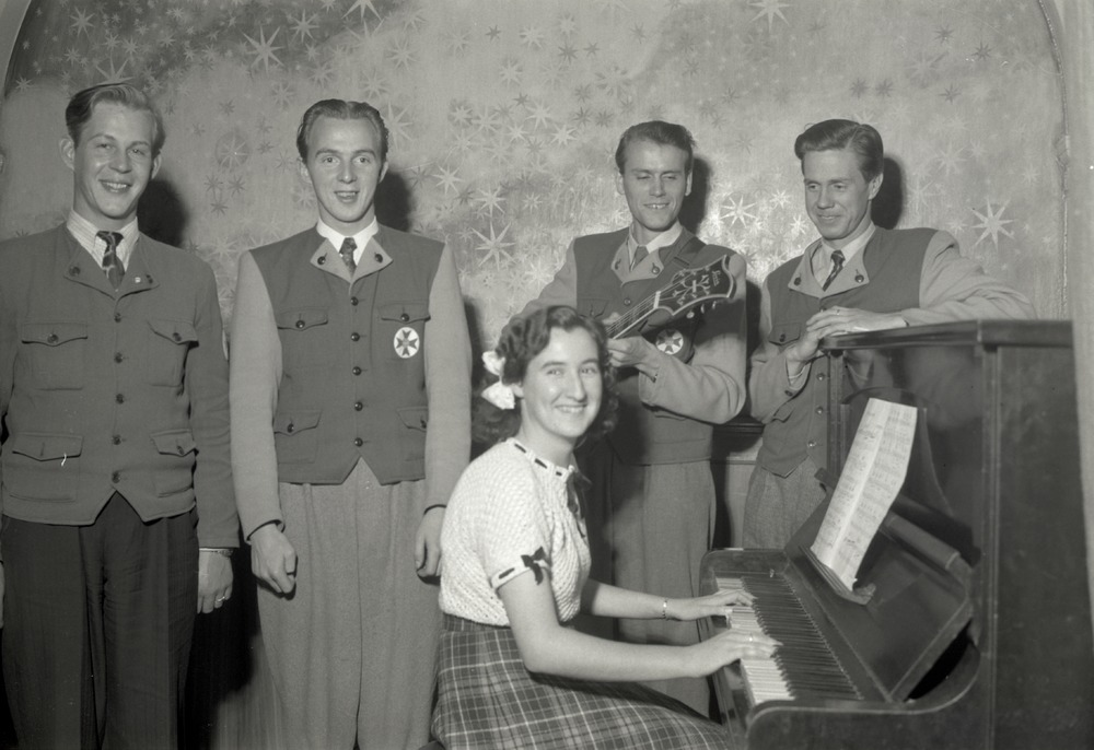 Godtemplarmöte i Temperancelokalen. Fotografi av en kvinna vid ett piano samt fyra män som står bakom henne framför en vägg. En av dem spelar gitarr.