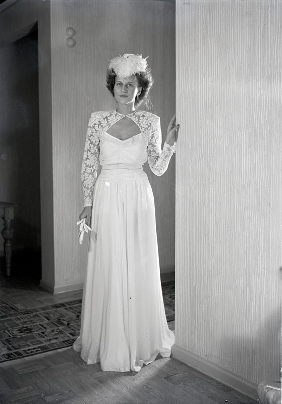 Excellas mannekänguppvisning på Hotell Astoria. Fotografi av en mannekäng iklädd en vit hellång klänning. Hon har också en vit hatt och håller ett par vita handskar i sin högra hand. Bakom henne ligger två mattor och intill väggen längst bak, till vänster i bild, står ett soffbord.