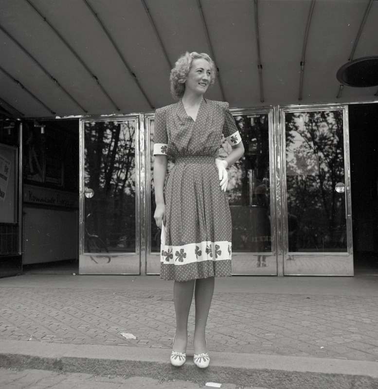 Excellas mannekänguppvisning på Saga. Fotografi av mannekäng stående på trottoaren utanför biografens entré. Hon är klädd i en prickig, knälång klänning. Hon har en vit handske på sin vänstra hand. Den andra handsken håller hon i sin högra hand.