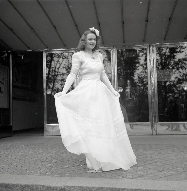 Excellas mannekänguppvisning på Saga. Fotografi av mannekäng stående på trottoaren utanför biografens entré. Hon är klädd i en vit långklänning, vita handskar och har en ljus tygblomma i håret.