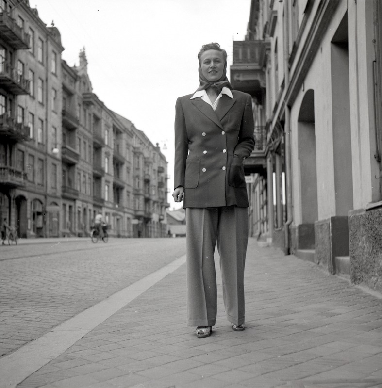 Excellas mannekänguppvisning på Saga. Fotografi av mannekäng stående på trottoaren i närheten av biografens entré. Hon är klädd i kavaj, kostymbyxor och har en sjal om håret. Hon har sin vänstra hand i kavajfickan. Bakom henne syns Drottninggatan och byggnader längs med båda sidor av gatan. En person cyklar mitt i gatan och en annan står bredvid sin cykel på andra sidan gatan.