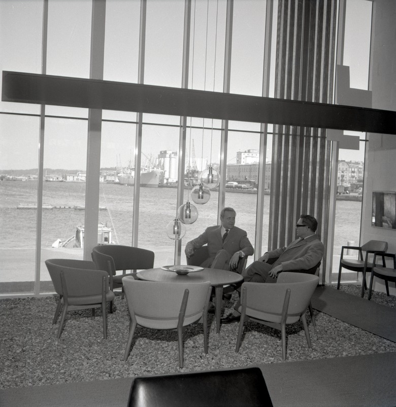 Fotografi av Askerheim & Hanssons utställning i paviljong på Parapeten. I utställningen sitter två män i varsin fåtölj. De ser ut att prata med varandra. Till höger om dem står några stolar uppställda längs en vägg. En tavla hänger på väggen ovanför. Utanför fönstret syns hamnen.