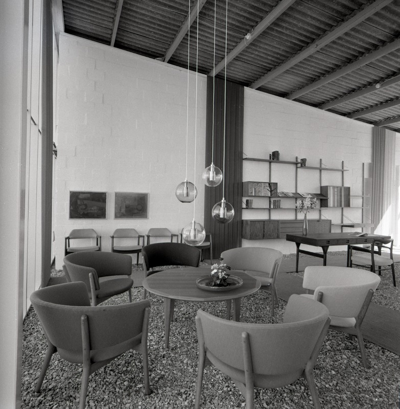 Fotografi av möblemang bestående av fåtöljer uppställda kring ett runt bord, vägghyllor, skrivbord med tillhörande stol samt fyra stolar uppställda längs en vägg. Ovanför stolarna hänger två målningar. Fotografiet är taget under Askerheim & Hanssons utställning i paviljong på Parapeten.