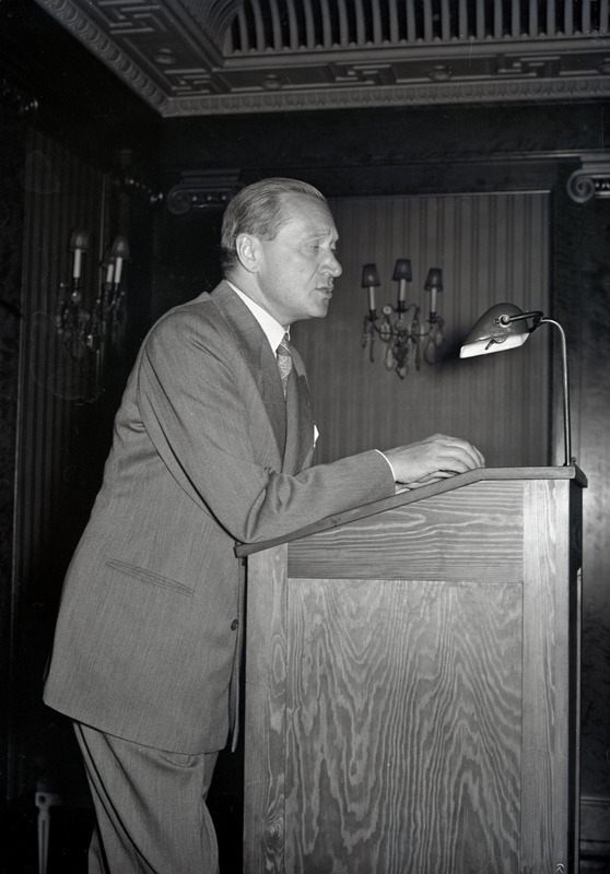 Okänd manlig talare i talarstolen under ett valmöte på Grand Hotell.