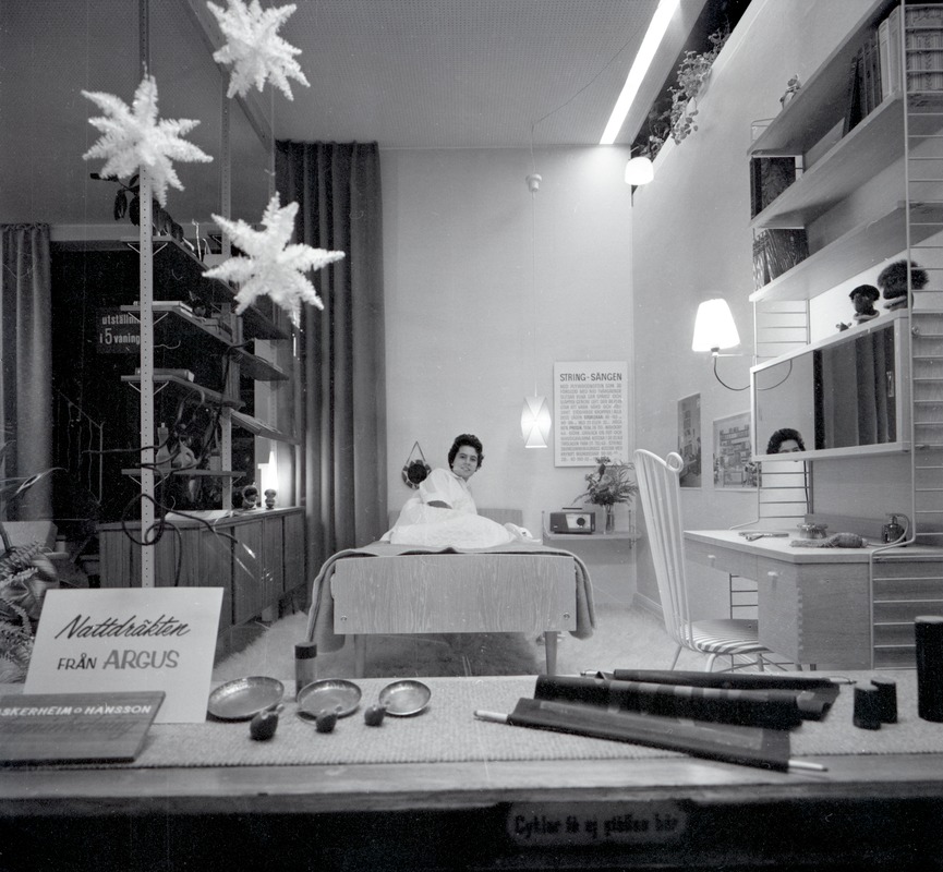 Fotografi av ett skyltfönster hos Askerheim & Hansson under julskyltningen 1960. Inne i butiken syns en kvinna halligga i en säng. Hon tittar in i kameran.