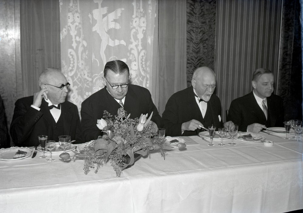 Fyra män, iklädda kostym, sittande vid ett middagsbord under Köpmannaförbundets jubileum på Grand Hotell 1944. På bordet, framför de två männen till vänster i bild, står en blomsterdekoration.
