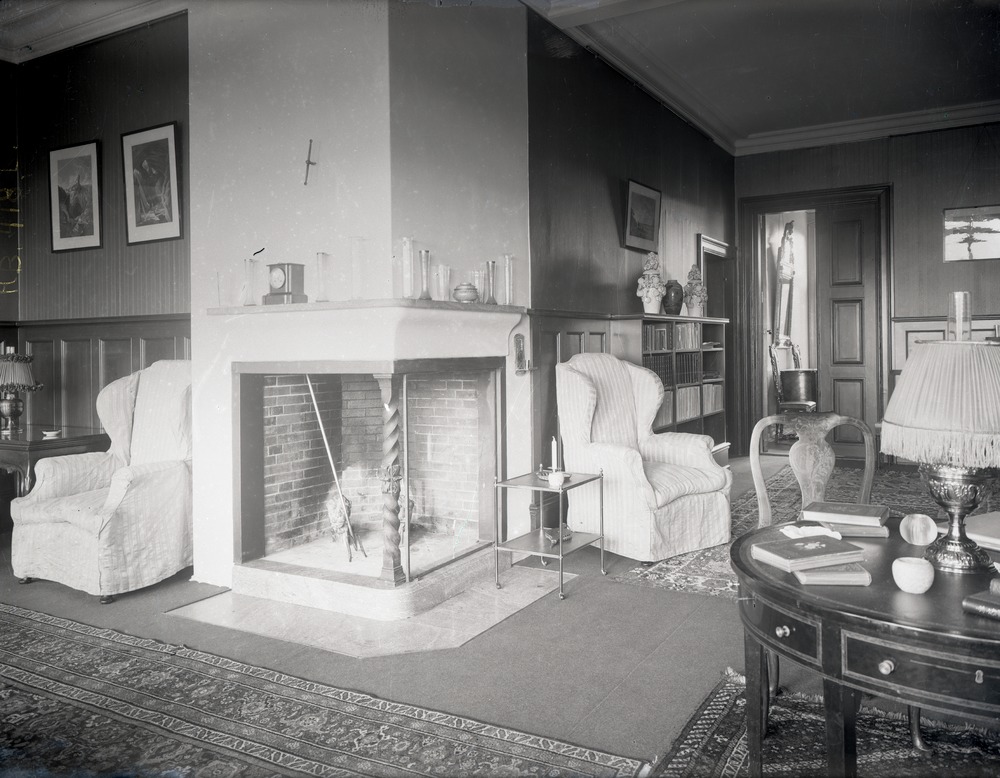 Fotografi av hallen på Sofiero slott. Ungefär mitt i bilden finns en murad eldstad. Till vänster om den står en ljus fåtölj och ett lågt bord. I förgrunden, till höger i bild, står ett bord och en stol. På bordet ligger två högar med böcker. En bordslampa står också på bordet. Längre in i bilden, till höger om eldstaden, står en likadan fåtölj som på vänstra sidan. Bakom denna står en bokhylla. Golvet är nästan helt täckt av mattor och väggarna är klädda med mörk bröstpanel och tapet. En av dubbeldörrar in till nästa rum står öppen längst in i bilden.