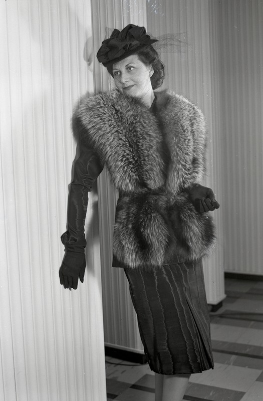 Excellas mannekänguppvisning på Hotell Mollberg. Fotografi av en mannekäng iklädd mörk dräkt, handskar och hatt med flor. Hon har även en päls som ligger över hennes axlar och som faller ner över hennes överkropp. Den ser ut att hållas på plats med ett bälte i midjan.