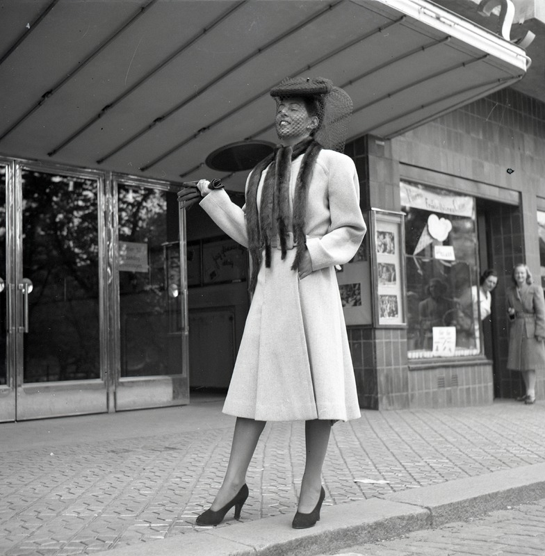 Excellas mannekänguppvisning på Saga. Fotografi av mannekäng stående på trottoaren utanför biografens entré. Hon är klädd i en ljus kappa, hatt med flor, päls runt halsen och har klackskor på fötterna. I ena handen håller hon ett par handskar. Snett bakom henne, till höger i bild, står två kvinnor i dörröppningen till en butik. De tittar mot mannekängen och fotografen.