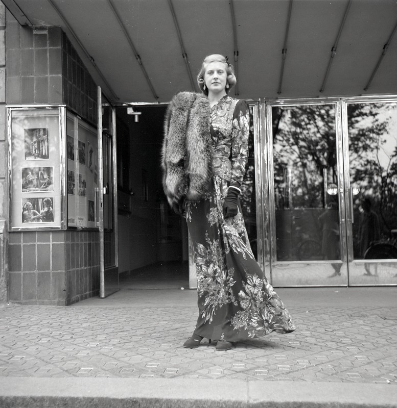Excellas mannekänguppvisning på Saga. Fotografi av mannekäng stående på trottoaren utanför biografens entré. Hon är klädd i en mönstrad klänning, klackskor, handskar och en päls som ligger över ena axeln.