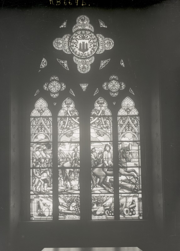 Beskrivning: Rådhuset. Glasmålningen i fönstren, utförda efter kartongen av professorn m.m. friherre G. O. Cederström. Magnus Stenbocks intåg 1710.