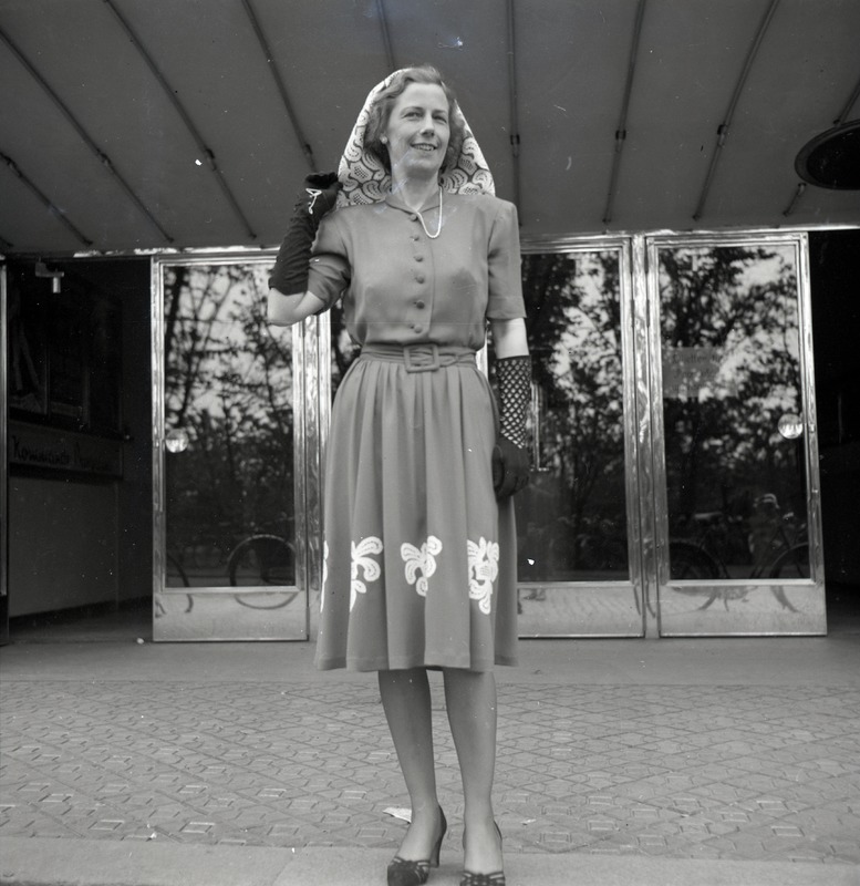 Excellas mannekänguppvisning på Saga. Fotografi av mannekäng stående på trottoaren utanför biografens entré. Hon är klädd i en knälång klänning med brodyr på kjoldelen. Hon är även iklädd mörka handskar, klackskor och någon typ av sjal eller huvudbonad.