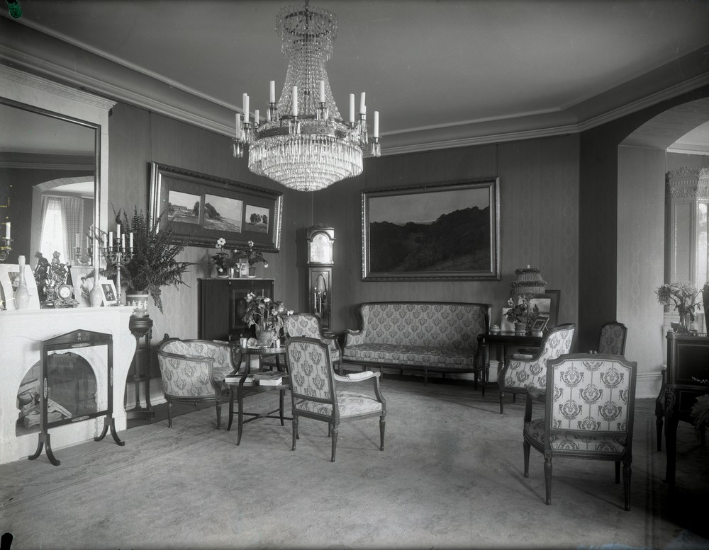 Beskrivning: Fotografi av salongen på Sofiero slott. En eldstad med en stor spegel uppe på spiselkransen finns till längst till vänster i bild. I mitten av bilden finns en sittgrupp med stolar, fåtöljer och soffor. Den största soffan står mot väggen längst in i bild. Runt omkring i rummet finns band annat en piedestal med en krukväxt, en golvklocka och ett soffbord med ramade bilder och en bordslampa. På golvet ligger en stor matta som ser ut att täcka nästan hela rummets golvyta. På väggarna hänger målningar och i taket hänger en stor ljuskrona.