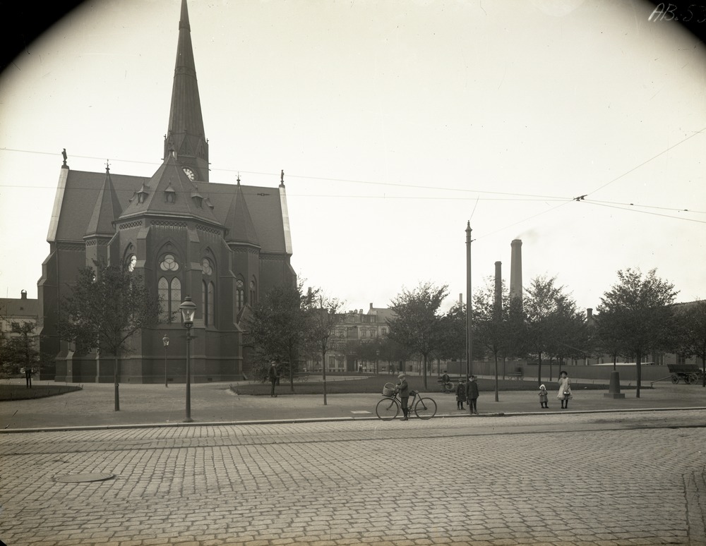 Gustav Adolfskyrkan fotograferad från Södergatan. Kyrkan är placerad till vänster i bild. I förgrunden syns Södergatan. På gatan står en pojke med en cykel. Till höger om honom, precis uppe på grusplanen står fyra andra barn. De är alla vända mot kameran. En bit bakom dem sitter en person på en parkbänk. Till vänster därom står en man, även han tittar mot kameran. Bakom torget och kyrkan syns byggnaderna på Carl Krooks gata. Över Södergatan syns spårvagnsledningarna.